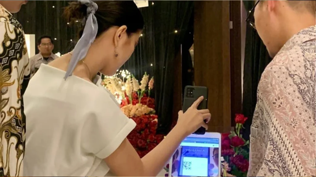 Tamu dapat melakukan check-in dengan QR Code yang ada di undangan digital maupun melalui kartu undangan yang di download langsung oleh anda berbentuk image, kemudian ara kan ke alat laptop, tablet, atau smartphone yang di sediakan oleh penerima tamu.